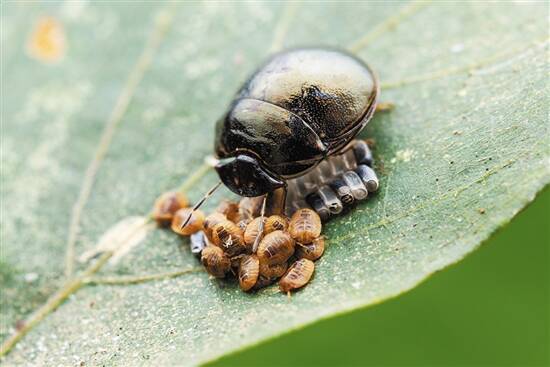 但是,我错了。半个多月后,摄影师幸运地在另一地拍到了这样一幕:一只龟蝽,在刚刚孵化的若虫和即将孵化的虫卵前,柔情满怀地照顾着它的孩子们(图二)。它用腹部,拥抱它们,温暖它们,抚慰它们,样子多么像一只护犊的老母鸡。