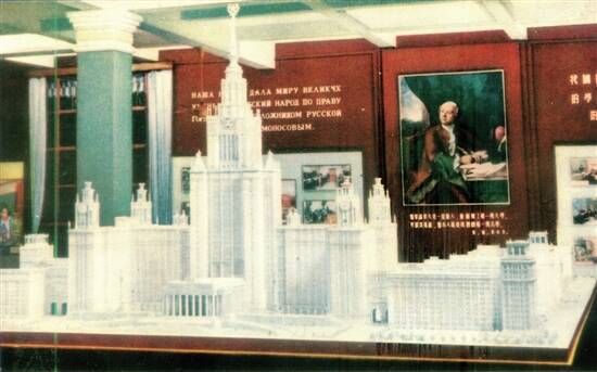 高等教育展厅,介绍苏联高等教育发展的情况,中间陈列国立莫斯科大学新校舍的模型(主楼高26层)。