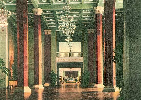 1、中央大厅:四面布置有反映苏联民众劳动、休息、教育和各民族平等友爱的大壁画。