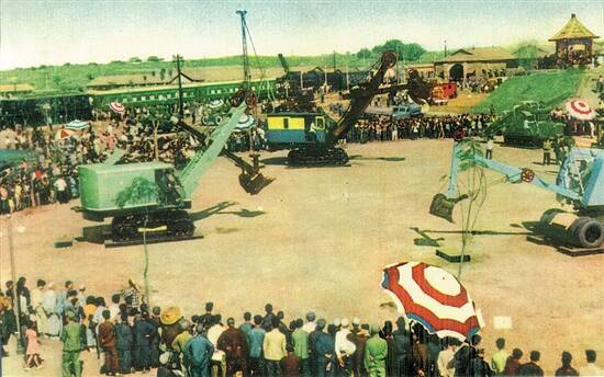后广场:筑路、建筑及铁路机车远景