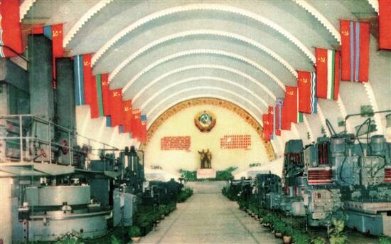 工业馆大厅,陈列有各种机床、纺织机、切削工具、量刃具等机器。引人注意的是重达70吨、加工零件达20吨重的立式机床,及能同时进行6道工序的6轴自动捧料车床。
