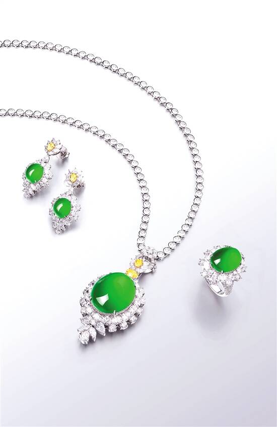 天然满绿翡翠配钻石吊坠、戒指及耳钉一套 华艺供图