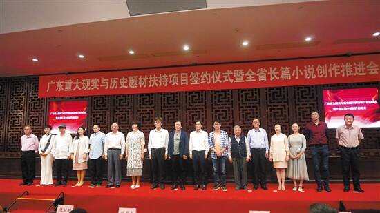 羊城晚报讯 记者黄宙辉、柳卓楠,通讯员何小流摄影报道:10月27日,广东重大现实与历史题材扶持项目签约仪式暨全省长篇小说创作推进会在广州举行,获得扶持的10部重大现实与历史题材项目与省作协进行了签约。记者从会上获悉,广东正在推动新时代的“小说革新”,广东长篇小说在未来几年或将迎来新的收获期。现阶段,广东文学具有量大、面广、后劲足的特点。目前,全省共有中国作协会员598人,省作协会员3919人,地级以上市作协、省作协各行业分会本级会员达10720人,县(区)文学组织本级会员达13089人。广东网络作家协会共有会员497人。若统计上广州、深圳等地网络写手,从事文学创作人数接近10万之众。