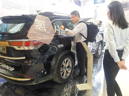 游客在观察氢能源汽车