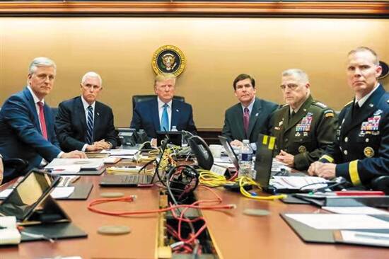 在照片中,特朗普和副总统、总统国安顾问、国防部长、美军参谋长联席会议主席等人坐在办公桌前,神情严肃。由此媒体也联想到2011年5月,在美军猎杀本·拉丹之后,白宫公布的奥巴马和一干要人在战情室观看行动过程的照片。