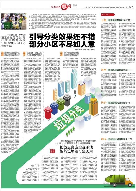 目前,省住建厅加强了对垃圾分类的政策指导和监督,并加大执法处罚力度,促进垃圾分类终端处理工作规范化。今年以来,广州对生活垃圾分类处理设施检查22000余次,发出整改通知书1600多份,处罚208宗。深圳对物业小区垃圾分类进行执法检查,发出近300份整改通知书。