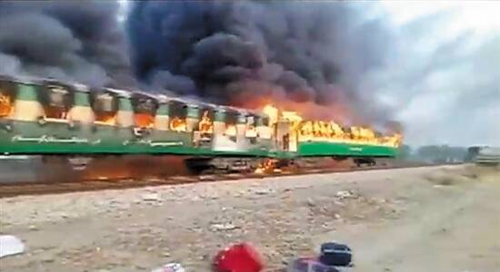电视画面显示,起火列车窜出火焰,消防人员努力灭火。巴基斯坦军方加入救援。