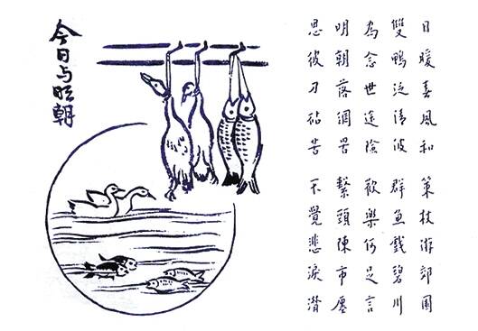 《护生画集》第一册,基调是伤感的,这五十幅画是丰子恺和弘一大师对杀生的一种无声抗议。丰子恺的画,贵在画面生动有故事感,搭配弘一大师的题字后,文字的渲染更容易将画面的气氛烘托出来。比如一幅题为《今日与明朝》的画,左边画的是风和日丽的今天,鱼、鸭在河水里活泼地嬉戏,右边则是明天,鱼、鸭被系着头吊在绳上陈列在市集……鲜明的生死对比,令人唏嘘不已。