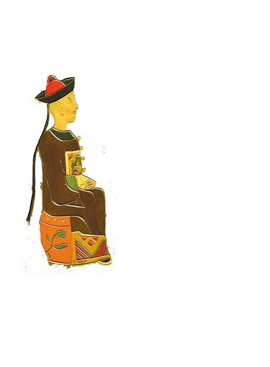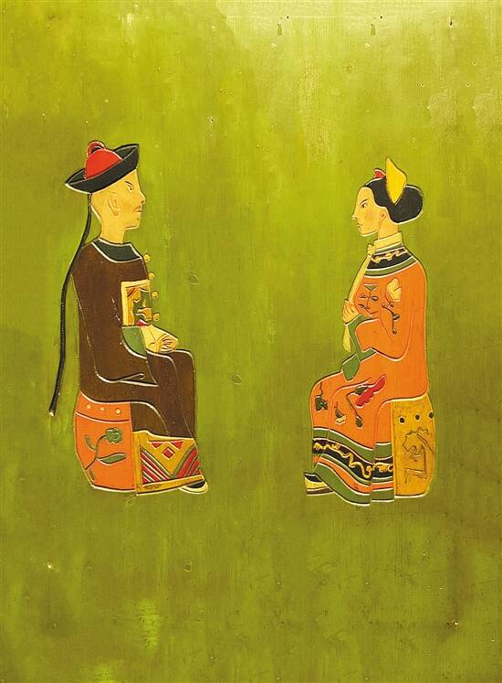 雨果绘制的木刻彩绘漆板人物(右同)