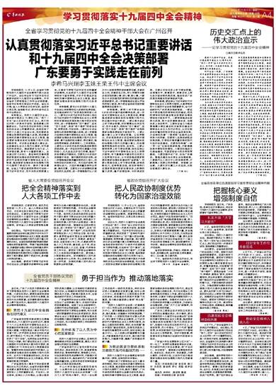 四中全会一闭幕,广东相继召开省委常委会会议和全省干部大会,传达学习习近平总书记重要讲话和四中全会精神,并对全省学习贯彻落实工作作出安排部署,强调学习宣传贯彻四中全会精神是当前和今后一个时期全省的头等大事和首要政治任务,要求各地各部门迅速兴起学习宣传贯彻热潮,确保全会精神在广东大地落到实处、取得实效。