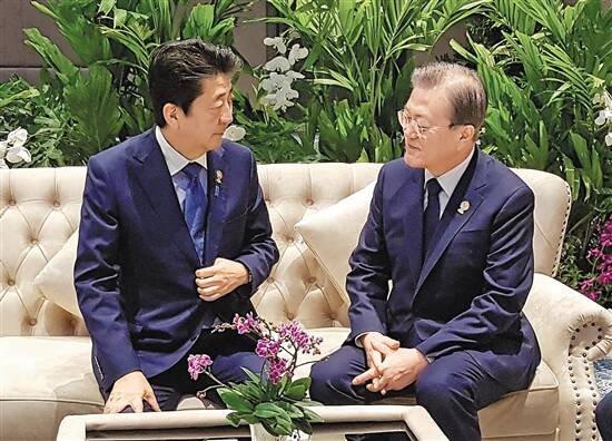 韩国总统文在寅和日本首相安倍晋三4日在泰国首都曼谷参加第35届东南亚国家联盟峰会及东亚合作领导人系列会议期间短暂会面。