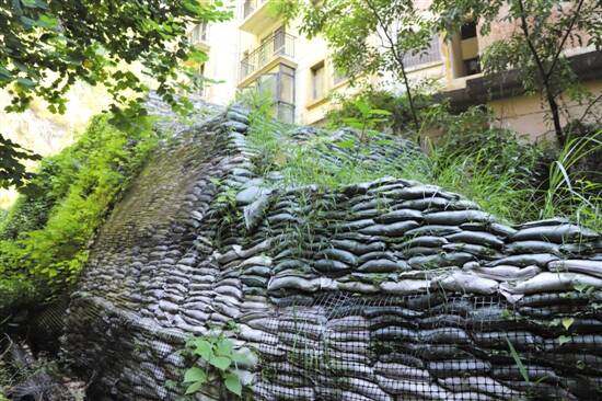 保利林语山庄受灾楼架空层后侧已建起7米高、3米宽沙包防护墙