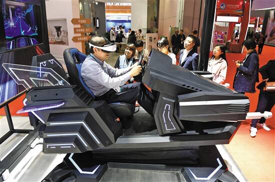 参观者在第二届进博会科技生活展区体验VR赛车 新华社发