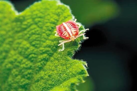 蜕皮之后的荔蝽,鲜嫩,娇艳,像个新生的宠儿。这时候,人们往往容易被它的外表所迷惑,以为可以握它在手,把玩欣赏,殊不知它的后胸腹板,暗藏着两个臭孔,在其受到惊吓或遇到危险时,便排两个臭屁,熏你个半死。