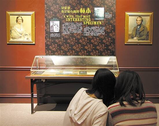 ◀2009年在北京自然博物馆展出的《达尔文》主题展上,达尔文与其妻子艾玛的照片 图/视觉中国