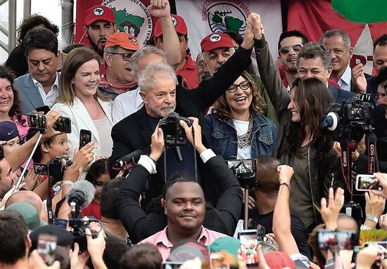 卢拉拥抱女儿和女友,站在写有“卢拉无罪”的横幅后面,握拳挥臂。支持者们挥舞旗帜,发出欢呼,庆祝卢拉出狱。