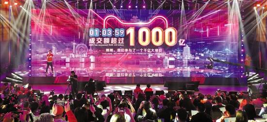 羊城晚报讯 记者沈钊摄影报道:11日11日零时,2019天猫“双11”全球狂欢节正式拉开帷幕,截至11日1时03分59秒,2019天猫“双11”全球狂欢节成交额突破1000亿元。其中,突破百亿元用时1分36秒,较2018年(2分05秒)快了29秒。