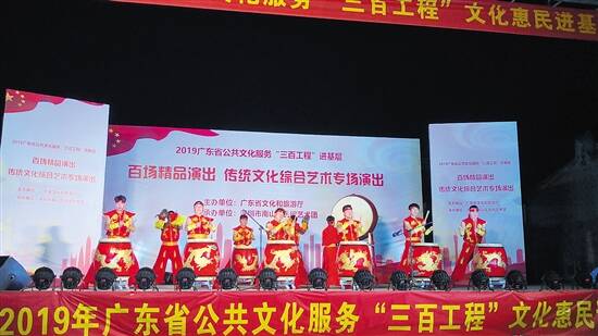 羊城晚报讯 记者黄宙辉、通讯员李卓鸿摄影报道:近日,由广东省文化和旅游厅主办的惠民文艺演出在揭阳、肇庆、梅州等地同步上演,受到当地老百姓热烈欢迎。这也标志着2019年广东省公共文化服务“三百工程”全面铺开。据悉,今年的“三百工程”将为各地群众提供300场文化大餐。广东省文化和旅游厅于2017年开始实施公共文化服务“三百工程”,每年向社会采购讲座、展览和文艺演出各100场,向粤东西北地区15个地市的县、镇、村三级以及厂矿、学校、军营等免费配送。该项工程是为进一步丰富基层群众文化生活,推进城乡公共服务均等化,不断增强人民群众的获得感、幸福感。
