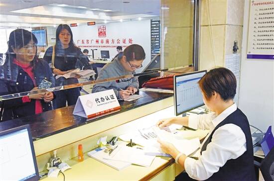 羊城晚报讯 记者薛江华,通讯员刘洪群、钟伯光摄影报道:26日上午,记者从广州市南方公证处了解到,南方公证处与省外事办外事服务中心联合推出了“出国公证+外事认证”一站式便民服务。在南方公证处办证大厅新设的“代办认证”窗口,记者看到不少市民办理“出国公证+外事认证”业务。为孩子办理去美国和德国的学历公证和认证的董小姐说:“以前很繁琐,要在两个部门间跑四趟,如今跑一趟在一个窗口就能解决问题。”