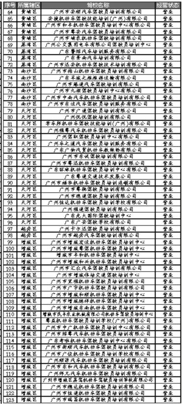 截至11月27日,广州市共有123家取得合法驾培资质并正常经营的驾校,清单见右表: