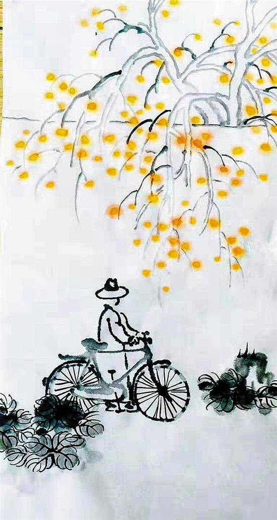 路见一树大柿子,果实累累倚高墙。主人不愿摘下来,留作鸟儿越冬粮。