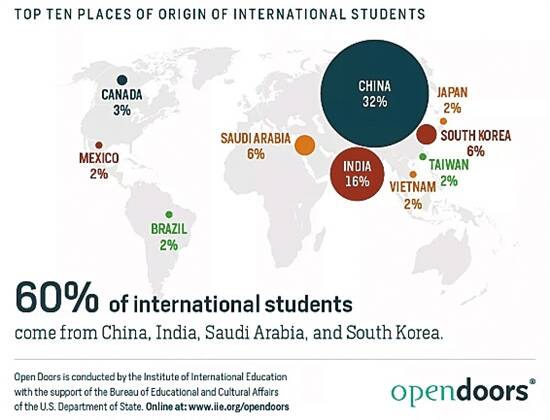中国留学生人数仍居美国国际学生人数首位