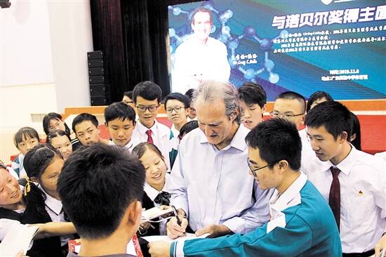 ▲2006年诺贝尔奖生理学或医学奖获得者、美国马萨诸塞州大学医学院分子医学教授克雷格·梅洛(Craig C.Mello)受到省实学生热捧