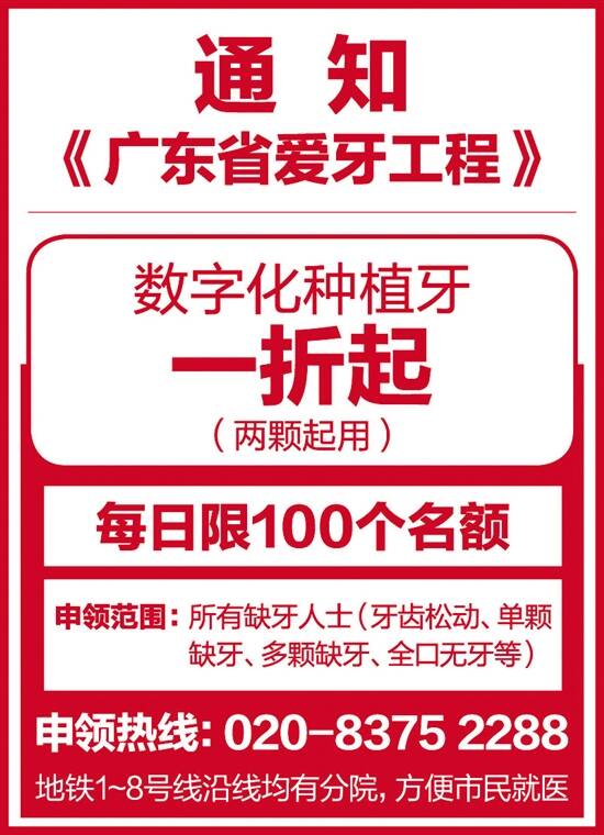 “广东省爱牙工程”跨年派福利:数字化种植牙1折起,种两颗,首颗低至1080元!缺牙市民拨打020-8375 2288申领(名额有限,先报先得)
