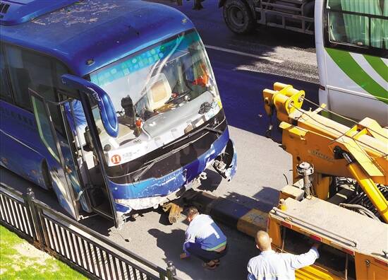 距离事发地50米左右,拖车正准备将事故中的大巴车拖离现场。大巴车车身印有“广东粤华发电有限责任公司(黄埔发电厂)”字样,车辆左后视镜缺失,车头受损严重,前面靠近司机位置的玻璃有裂纹,右后视镜上有明显的刮擦痕迹。