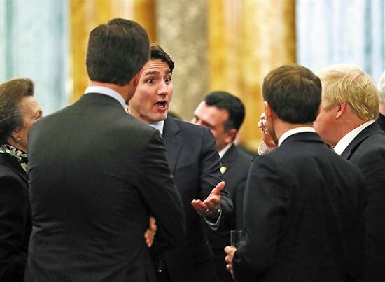 特鲁多(左二)与其他领导人调侃特朗普的画面 图/视觉中国
