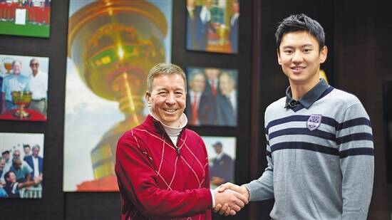 美巡赛副总裁、大中华区董事总经理葛国瑞(左)在美巡赛北京办公室欢迎宁泽涛(右)