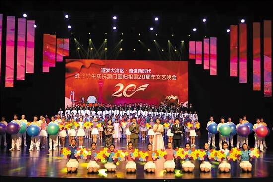 珠澳学生庆祝澳门回归20周年文艺晚会昨在珠海举行,两地千名青年学子载歌载舞,青春洋溢 羊城晚报记者钱瑜 通讯员梅曦 摄