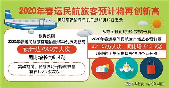 民航局运输司司长于彪12日表示,根据预测,2020年春运民航旅客运输量将再创历史新高,预计达7900万人次,同比增长约8.4%。高峰期间,民航日均保障航班量将在1.6万架次以上。