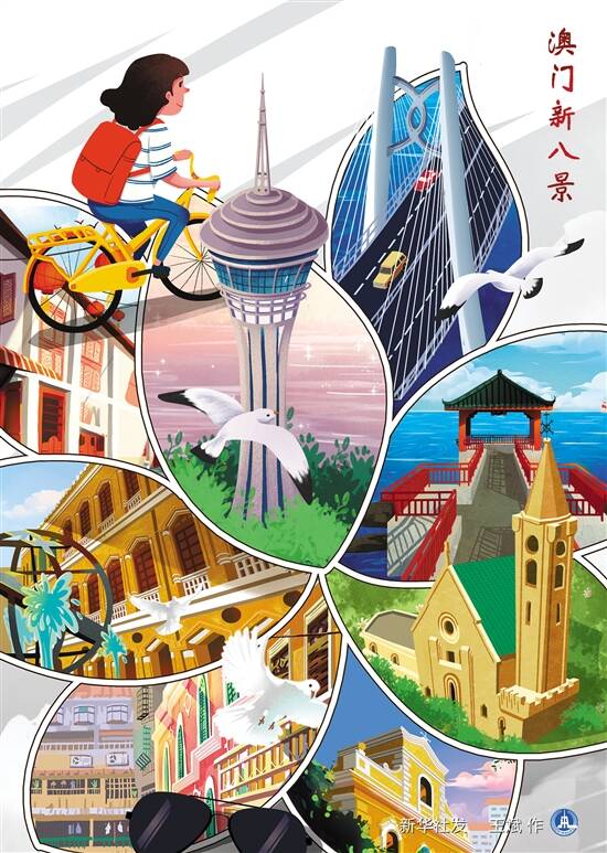 来到澳门的游客,除了到“大三巴”打卡,还可以走进“澳门新八景”,体验更多澳门独特的自然、人文景观和本地美食。 2019年3月,由澳门中华文化交流协会主办的“澳门新八景”评选出炉,并被冠以情景兼备的四字名:西山望洋、双湖塔影、亭前葡风、龙爪观涛、路环渔韵、爱巷倾情、福隆新貌和桥牵三地。新华社发