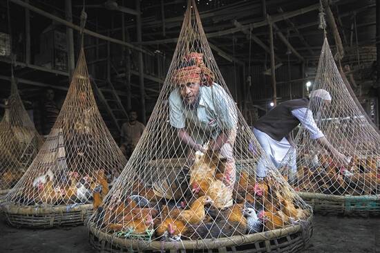 孟加拉国达卡有活鸡市场。一名男子正在探手入网中捉鸡