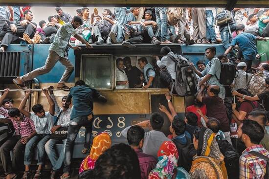 孟加拉国达卡街头,上下班高峰时段挤车的人们