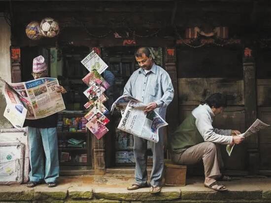 每一张照片都仿佛活的记忆,静静讲述着光阴的故事,通过照片,你似乎可以感受到光影的飞逝、城市的变迁,图为人们在尼泊尔巴克塔普尔的街上阅读报纸