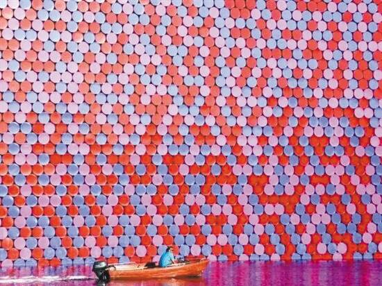 在英国伦敦海德公园,一艘船驶过克里斯托的桶艺术装置