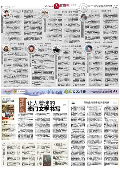 邓晓炯:我希望看到日后更多界限会逐渐被打破——澳门的作家和作品,可以更多地和内地、港台以至海外华语地区交流互动;我也希望不同语言之间的藩篱得以打破——澳门更多的中文作品可以被翻译成英、葡等语言,而澳门以及外语世界(如葡文、英文等)与“澳门”相关的史料、作品也能被翻译成中文,让澳门的读者能看得见、读得懂;还希望不同艺术领域之间的分野得以打破,文学与电影、电视、戏剧、舞蹈之间,能更多往来,催生出有趣的跨界合作。