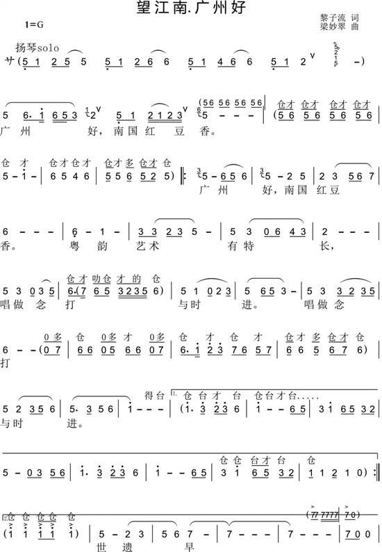 其后,梁妙翠又将广州老市长黎子流的《望江南·广州好》谱成了粤曲小调。黎子流这首词,专为粤剧成功申请“世遗”十周年而作。