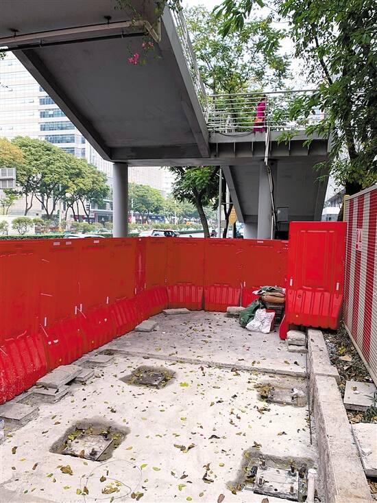 12月18日,记者在东风东路福今路口和陵园西路口两座天桥下方,均发现红色挡板围蔽着地块,围蔽内的地板已被凿开,有四个金属构件被安装在凿开的位置。围蔽挡板上贴着的告示称,围蔽期限至今年12月31日。