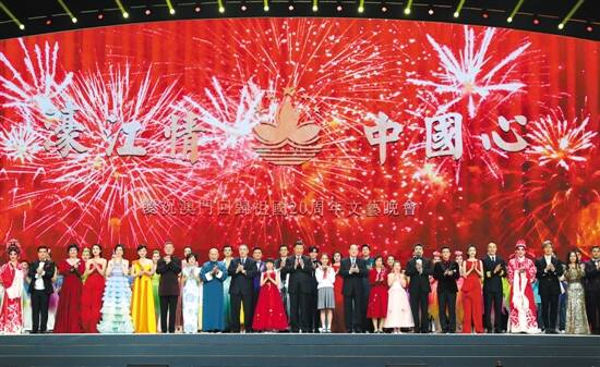 晚会最后,习近平在崔世安和澳门特别行政区候任行政长官贺一诚陪同下走上舞台,同主要演职人员一一握手,并同全场观众一起高唱《歌唱祖国》,祝愿伟大祖国繁荣昌盛,祝福澳门明天更加美好。晚会气氛被推向高潮,歌声和掌声汇成欢乐的海洋。