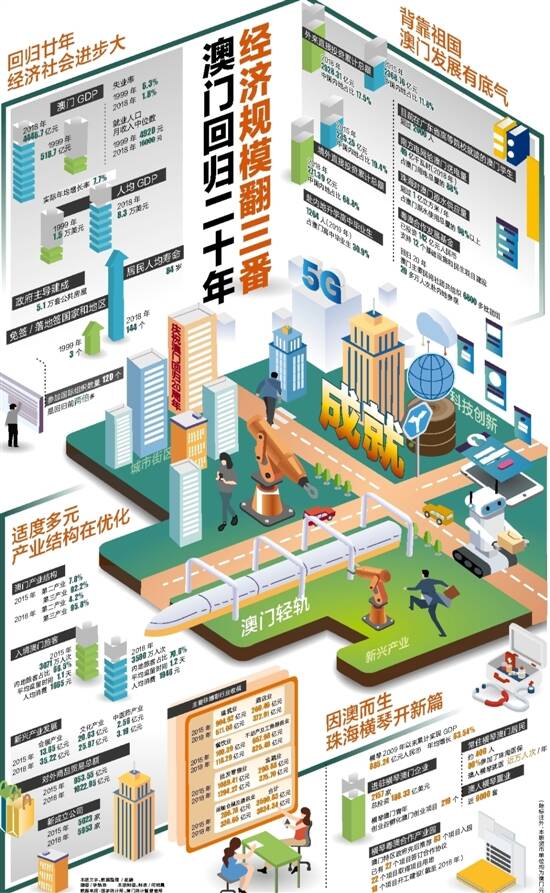 1999年至2018年,澳门经济总量由518.7亿元(澳门元,下同)增加到4446.7亿元,;人均GDP由1.5万美元提高到8.3万美元。澳门进入历史上发展最好最快的时期,成为全球经济增速最快的地区之一。