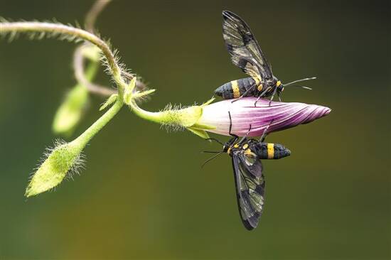 此刻,在两只鹿蛾之间,只隔着一朵花苞。这真是爱情诞生最美好的场所了,花朵即将盛开,芳香即将四溢,爱情即将到来。两只鹿蛾,一上一下,一左一右,微风轻拂,花苞微微颤动,就像两颗渴盼爱情的心,在花丛间甜蜜共振。