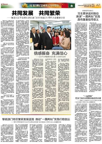 据新华社电 庆祝澳门回归祖国20周年大会暨澳门特别行政区第五届政府就职典礼20日上午在澳门东亚运动会体育馆隆重举行。中共中央总书记、国家主席、中央军委主席习近平出席并发表重要讲话。内地及港澳专家接受新华社记者专访时表示,习主席的重要讲话系统总结了澳门“一国两制”成功实践的重要经验,站高望远,就推动澳门特别行政区各项事业踏上新台阶提出希望、指明方向。他们指出,重要讲话彰显了中央坚持“一国两制”方针不动摇的坚定决心,彰显了中央必定会把香港、澳门两个特别行政区管治得更好的制度自信。随着“一国两制”制度体系不断完善,香港、澳门与祖国内地同发展、共繁荣的道路必将越走越宽。