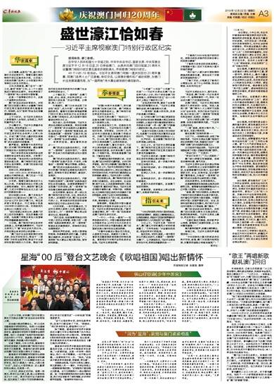 “还有一次,我们在街上看到五星红旗和绿色的澳门特区区旗一起迎风飘扬,我忍不住感叹了一句:‘那两面旗的颜色真好看。’一位澳门老爷爷路过,对我们笑了笑,说了一句粤语。虽然不能完全明白他在说什么,但我能感受到,他也在赞叹,澳门与我们是心连心、在一起的。”王梦珂说。
