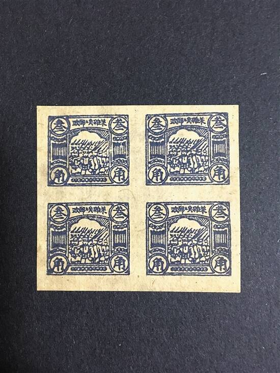 其实在收藏拍卖界,苏区邮票交易虽少,但成交价也相当骄人,江西赤色邮政1分浅红色销印票1992年《目录》标价30万元,23年后在香港拍出330万港币,而全版新票(72枚)价值应过亿元。再如苏维埃邮票中的蓝色三角面值大进军小型(全)张,上品的国外市场价已近千万元。