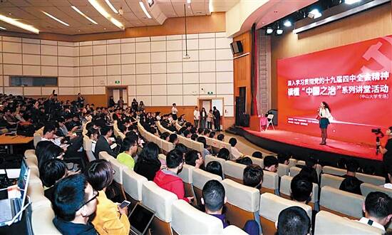 昨日,首场活动在中山大学广州校区东校园举行,来自广东多所高校约500名师生参加了活动。学习贯彻党的十九届四中全会精神省委宣讲团成员、省社科院副院长赵细康,南沙大桥项目原副总工程师鲜荣,中山大学学生代表卜熙做主题报告。