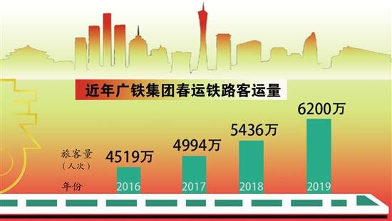 “宇宙中心”的说法当然不是凭空而来——羊城晚报记者梳理发现,近年广州春运铁路客流量增速明显。从每年春运发送旅客数据来看,2014年春运广铁集团共送旅客3645万人次,到了2019年春运广铁集团发送旅客6200万人次,5年时间,发送旅客数量翻了近一倍。