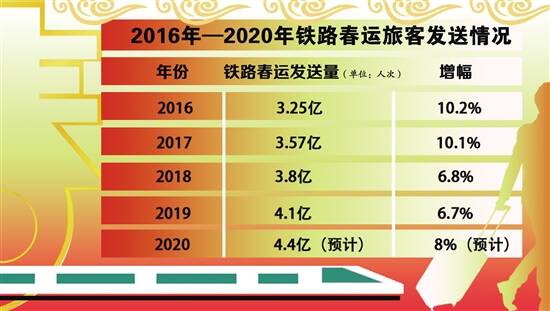 羊城晚报记者比较2016年以来的春运旅客数据发现, 近年来铁路春运发送旅客量逐年升高,由2016年的3.25亿人次增长到2019年的4.1亿人次。预计2020年春运期间全国铁路将发送旅客4.4亿人次。这意味着,5年时间我国铁路春运旅客发送量足足将增加了1亿多人次!